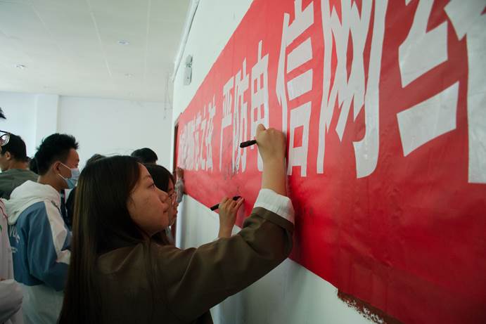 本次活动由汽车学院党委副书记、副院长杨建主持。他指出,当前,电信网络诈骗案件呈高发态势,犯罪分子利用电话、短信、网络聊天工具等多种手段实施诈骗犯罪。很多犯罪分子利用一些学生的虚荣心、贪便宜、单纯等心理特点实施各种诈骗伎俩,使部分学生蒙受巨大的财产损失和精神压力。结合实例,他从不同角度向学生讲解了电信诈骗的起因、防范要点等事宜,并教育引导学生从思想上树立预防电信诈骗的意识,同时要求所有学生下载“国家反诈中心APP”,进一步从国家及社会层面了解预防电信诈骗的相关内容。最后,在工作人员的号召下,所有同学均在条幅上签名并纷纷表示将提高警惕、谨防上当受骗。