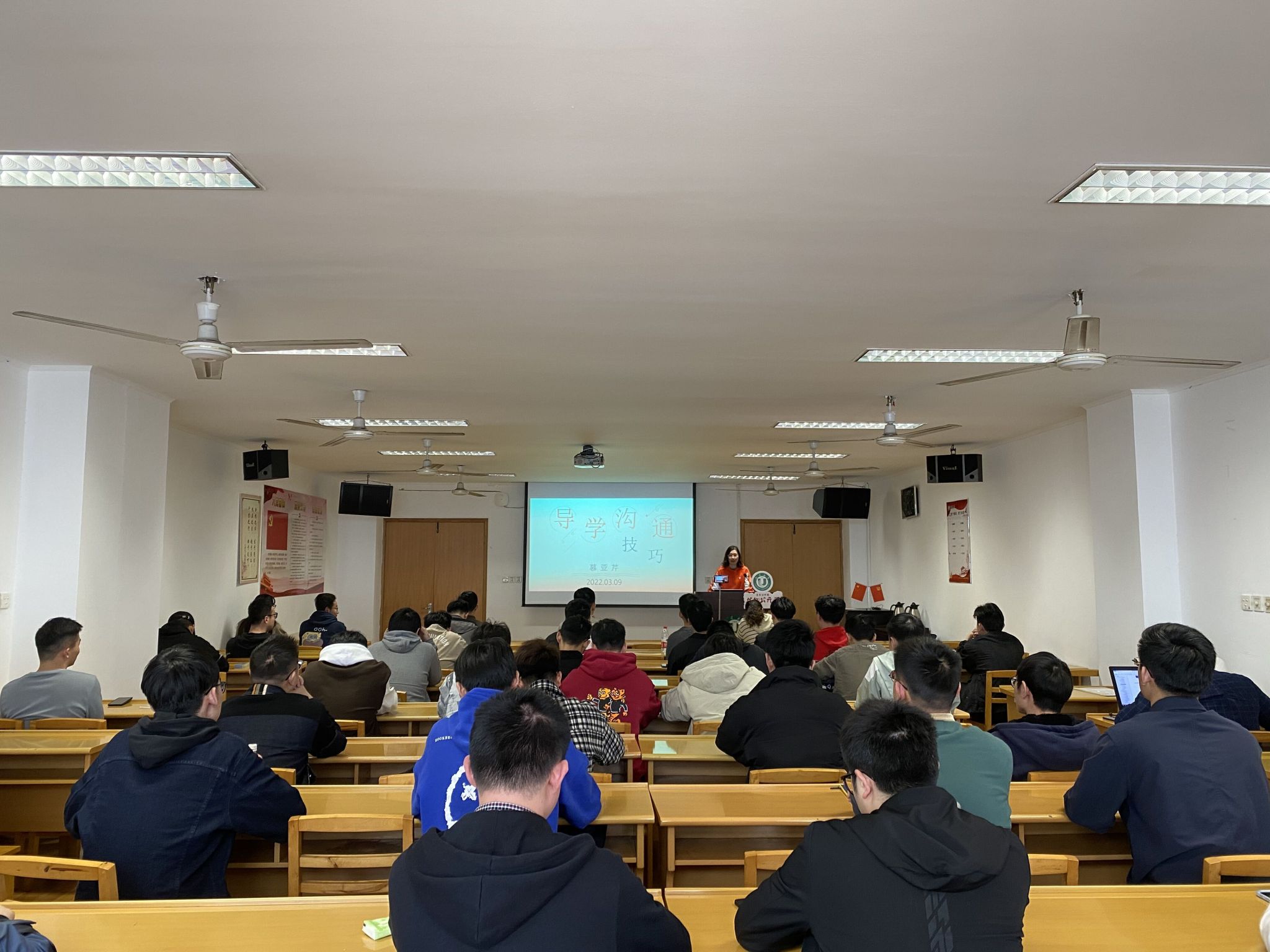 此次讲座采取线下和线上相结合的方式,慕老师主要从学界研究、师生关系、知己知彼和沟通技巧四个方面与同学们进行分享交流。接着,慕老师结合自身读研究生、读博士的个人经历,通过一些幽默的小视频向同学们重点分析阐述了沟通的技巧、表达的艺术、建立和谐师生关系的技巧等。