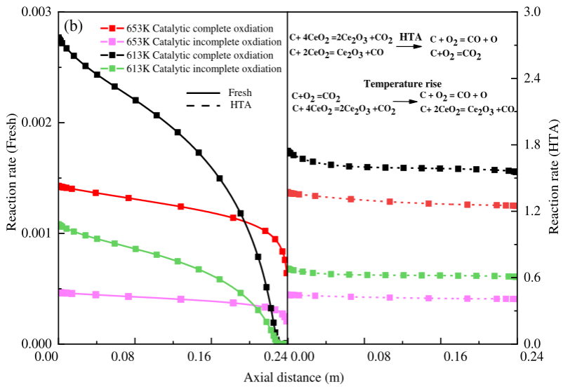 此外,碳烟基于Ce催化剂的起燃及低温快速氧化性能是催化型微粒捕集器的再生性能的重要评价指标之一,直接反映了碳烟低温燃烧的催化氧化反应路径变化及催化剂的动力学诱导特性(如图2),对于验证和改进催化型微粒捕集器的复合再生性能具有重大意义。王攀教授团队基于“零维”传热传质模型对碳烟催化燃烧性能变化及催化燃烧反应路径变化进行了系统的分析和研究。相关成果以“Numerical study on effects of hydrothermal aging to composite regeneration in CeO2-based catalyzed diesel particulate filter”为题在燃烧领域国际顶级会议Proceedings of the Combustion Institute上进行了宣读。