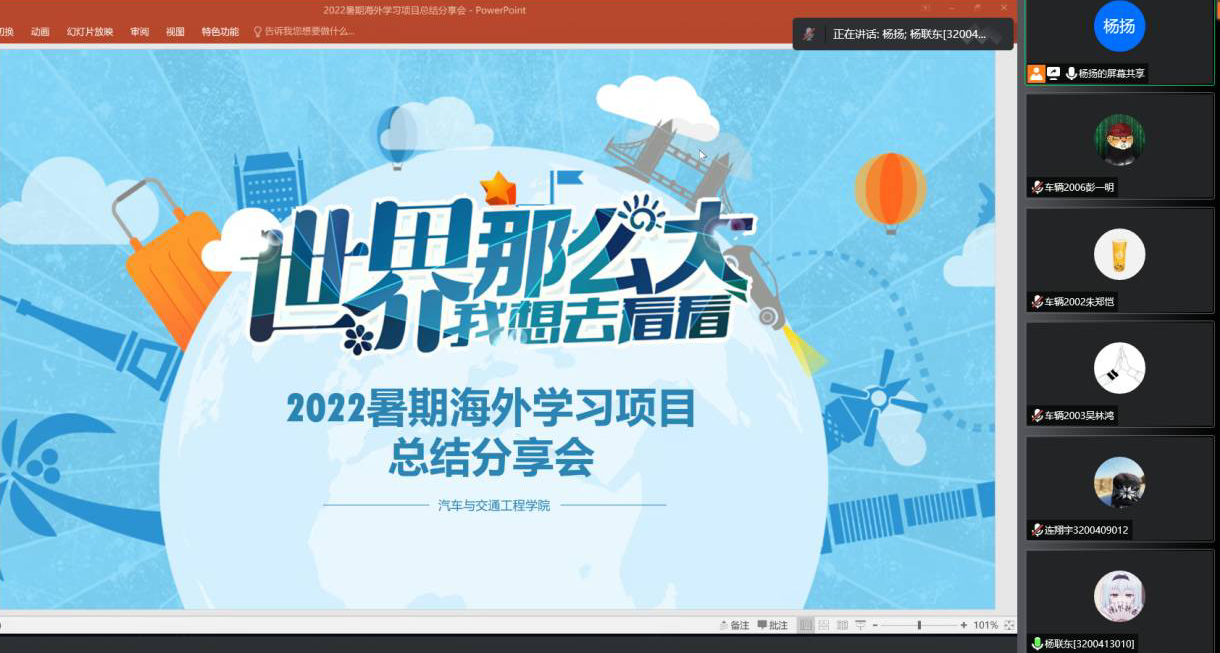 为加强学生的国际化意识,鼓励更多学生开拓国际化视野,参与海外学习项目,9月7日,汽车学院召开2022年学生暑期海外学习项目总结分享会。会议由辅导员杨扬老师主持,参加暑期海外学习的同学出席了本次分享会。