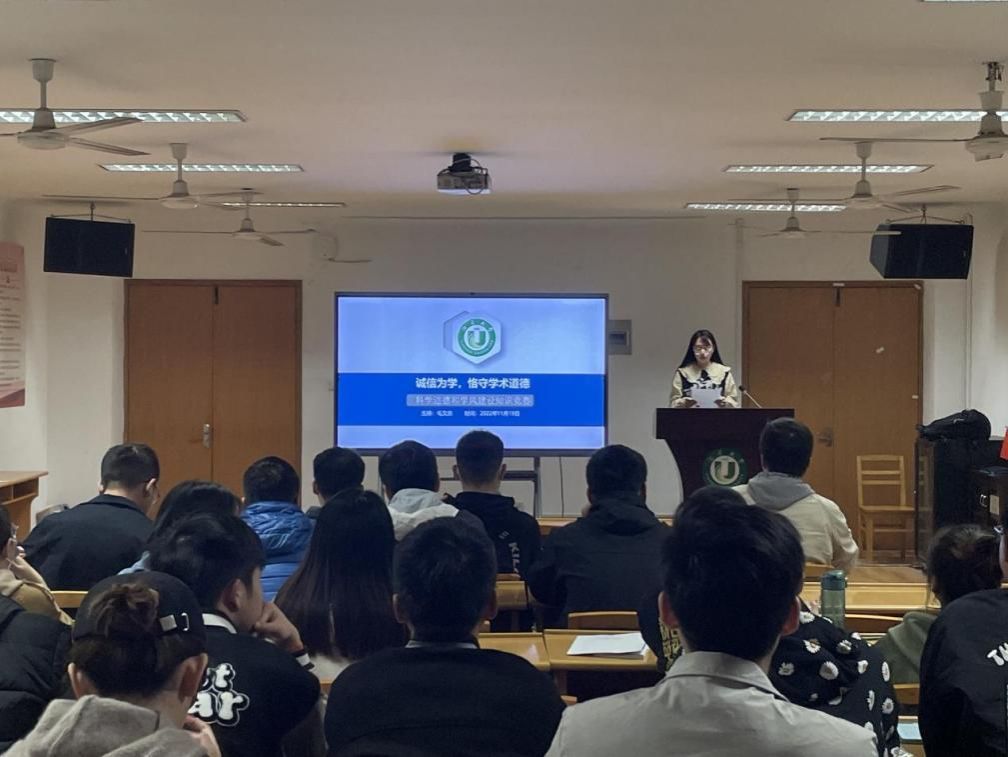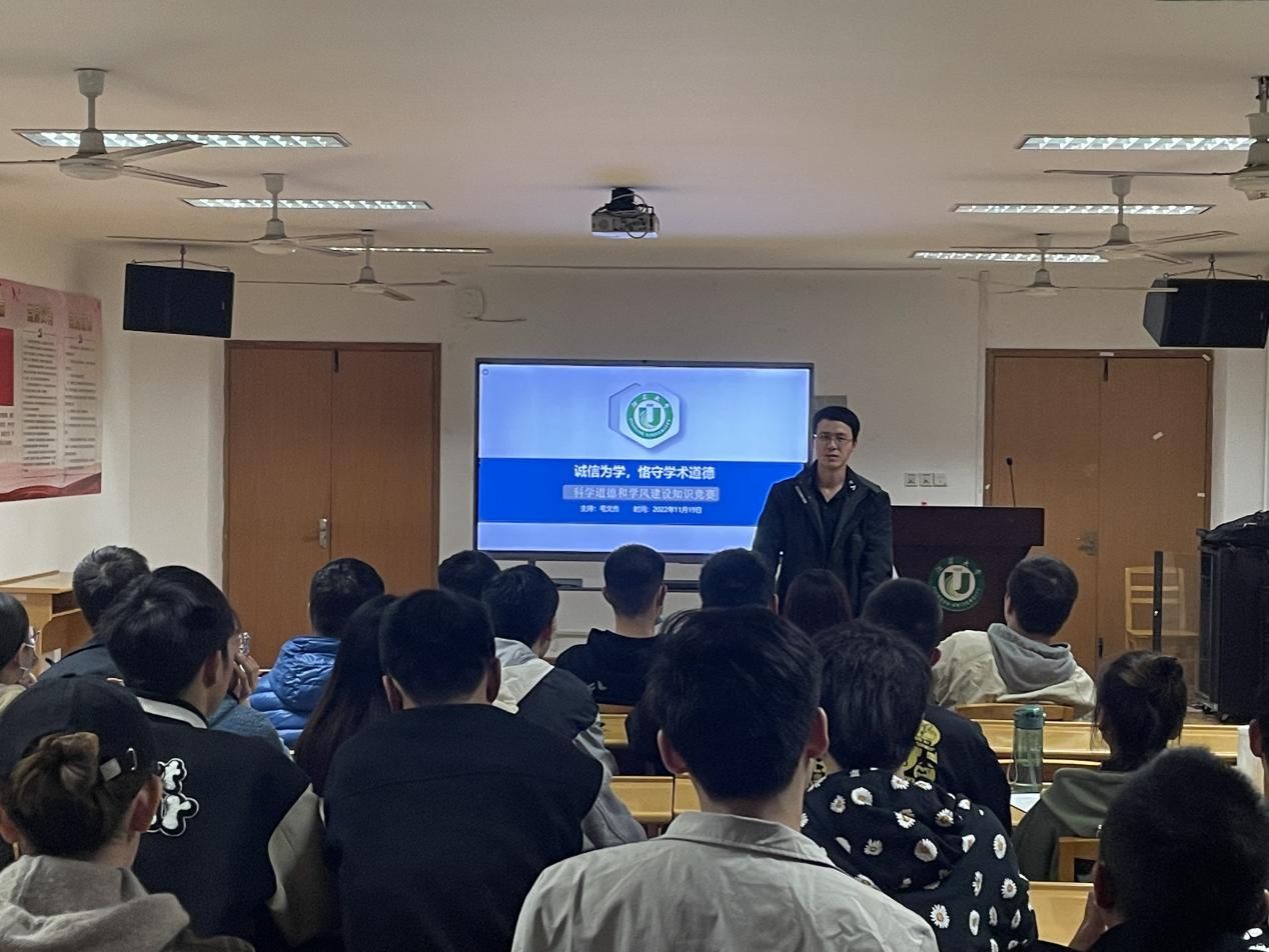 11月19日,汽车学院在汽车楼311报告厅举办“诚信为学,恪守学术道德” 科学道德和学风建设知识竞赛活动,活动由汽车学院研究生会学术部毛文杰、陈必开主持,辅导员陶旺仔为指导老师,49名研究生参加。