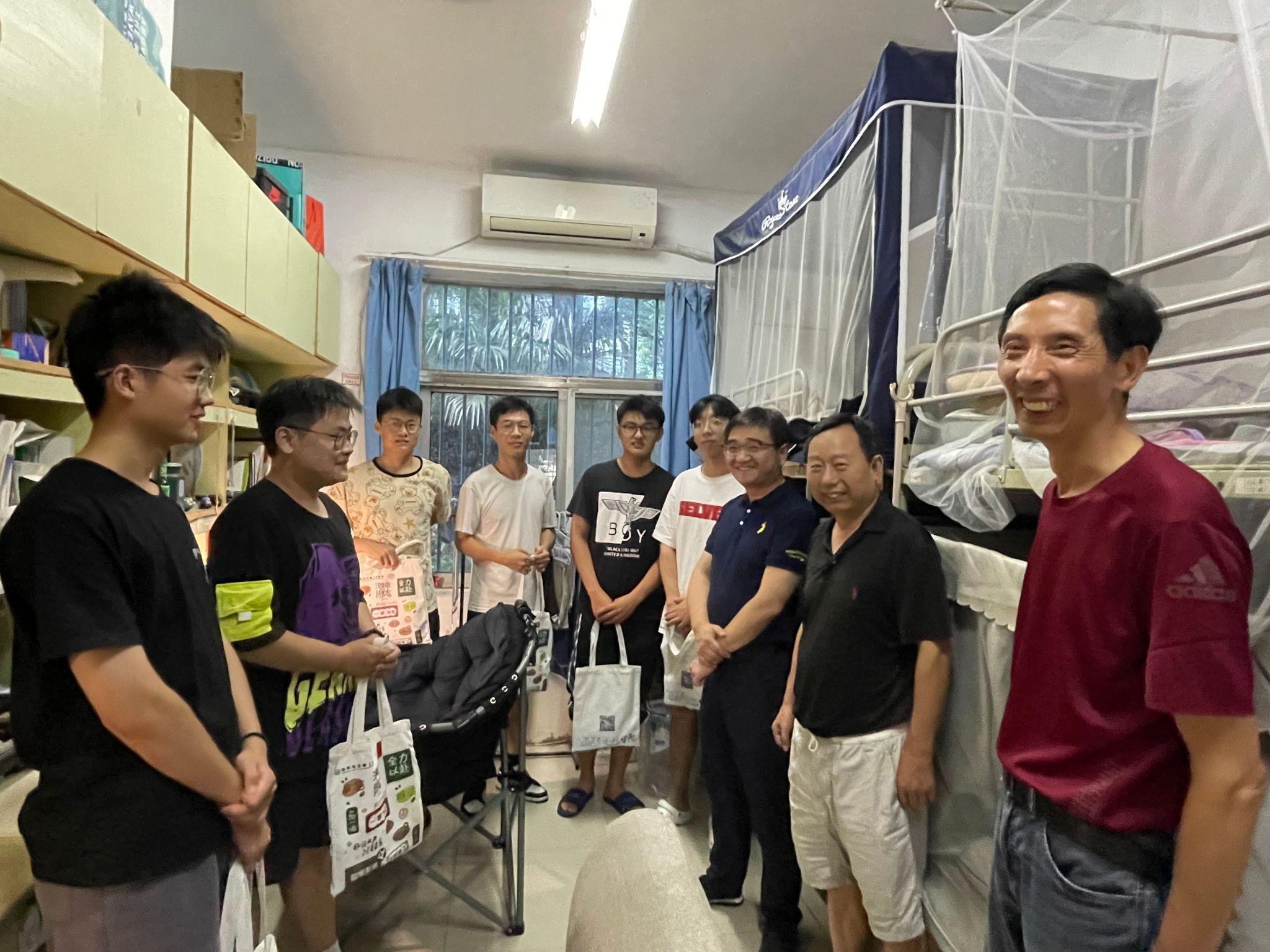 7月31日,汽车学院党委书记施爱平、院长尹必峰、党委副书记杨建、关工委朱茂桃老师在辅导员杨扬、丰德两位老师的陪同下深入宿舍看望暑期留校学生。在宿舍里,老师们与学生进行亲切交流。施书记十分肯定同学们暑期留校参与研究生备考、科研、竞赛等不畏酷暑、只争朝夕的精神,同时勉励同学们要珍惜时光、脚踏实地。尹院长十分关心同学们的留校生活,提醒同学们要劳逸结合,平衡好压力和动力,保持身心健康,生活学习上的需求要及时向学院反映。杨书记特别强调了安全问题,提醒同学之间要互相帮助和关心,谨防电信诈骗、极端天气、交通安全等。