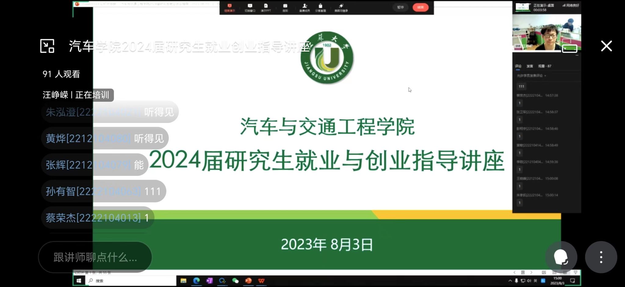 为进一步做好研究生就业服务工作,持续不断地开展有针对性的就业引导教育,8月3日,汽车学院在云端举办2024届毕业研究生就业创业指导讲座,本次讲座由研究生辅导员汪峥嵘、陶旺仔主讲,200余名2024届毕业研究生参加。
