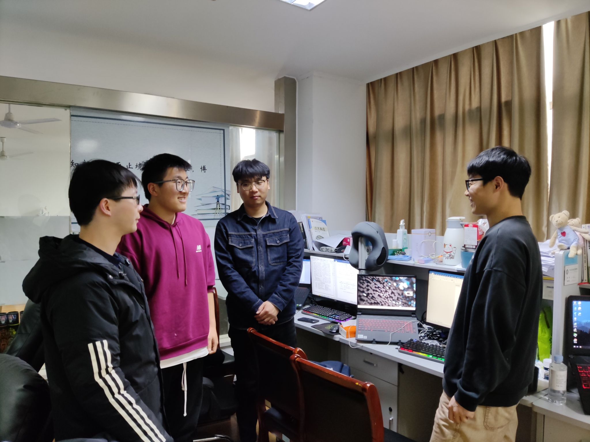 汪峥嵘老师与同学们交流,向同学们了解寒假生活和科研进度等,鼓励学生在新学期要有新气象和新要求,也要养成良好的生活和学习习惯,奋楫扬帆,踔厉奋发。另外,重点提醒同学们要切实提高研究生工作室的用电安全意识,严密防范电信网络诈骗,养成勤于整理内务的好习惯,努力营造干净整洁的生活、学习和科研环境。