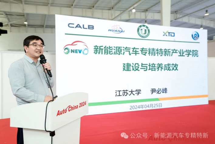 会议由中汽检测董事长辛强主持,工业和信息化部中小企业发展促进中心人力资源发展研究所副所长陈琛和江苏大学教务处处长、江苏大学新能源汽车专精特新产业学院院长尹必峰教授分别致辞。
