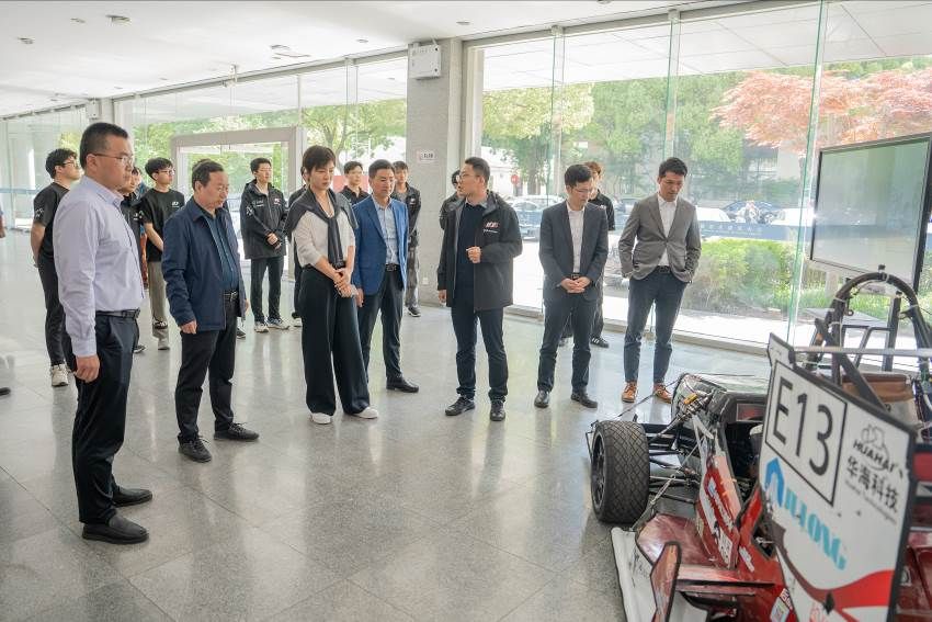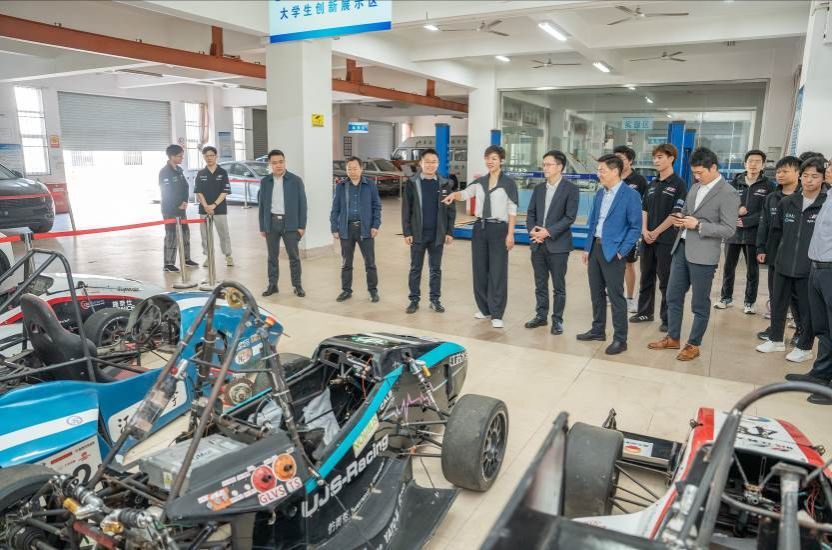 万新伟一行参观了江苏大学方程式赛车实验室,工作人员介绍了车队的发展情况、取得成绩和未来规划。