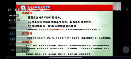 6月5日,汽车学院在407会议室召开了2023级本科生春学期期末线上会议。本次会议由汽车学院辅导员张杜、柴弘枫主持召开,2023级本科生全员参与。