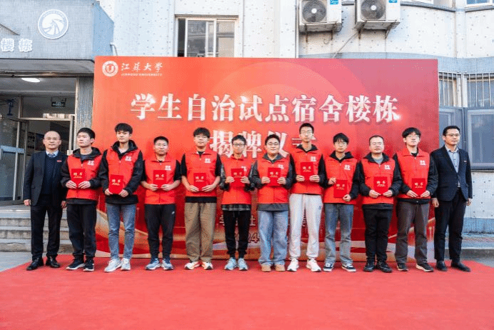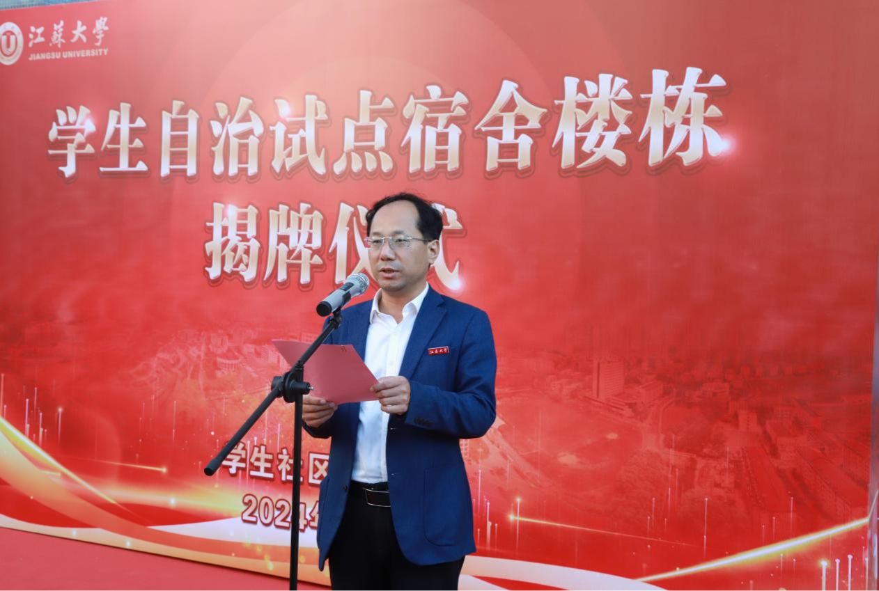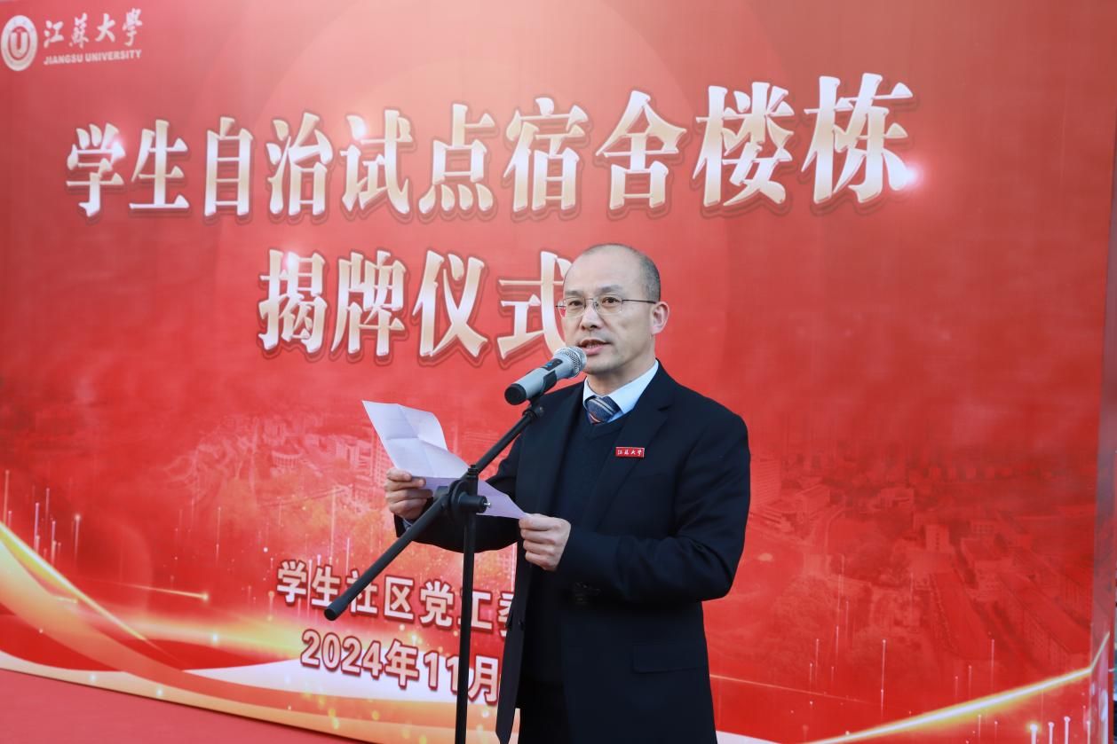 11月6日,学校在汽车学院2024级本科男生D区3栋学生社区举行学生自治试点宿舍楼栋揭牌仪式。副校长、学生社区党工委书记任旭东,镇江松艺数字科技有限公司总经理卓岩松,学生社区党工委常务副书记、学工处处长任泽中,校团委书记张永强,求知书院党总支书记江永华等相关部门、汽车学院学工副书记、副院长杨建、2024级辅导员丰德、杨扬、学工处“一站式”学生社区条线对接负责人柴弘枫出席揭牌仪式。仪式由学工处副处长张芬主持。