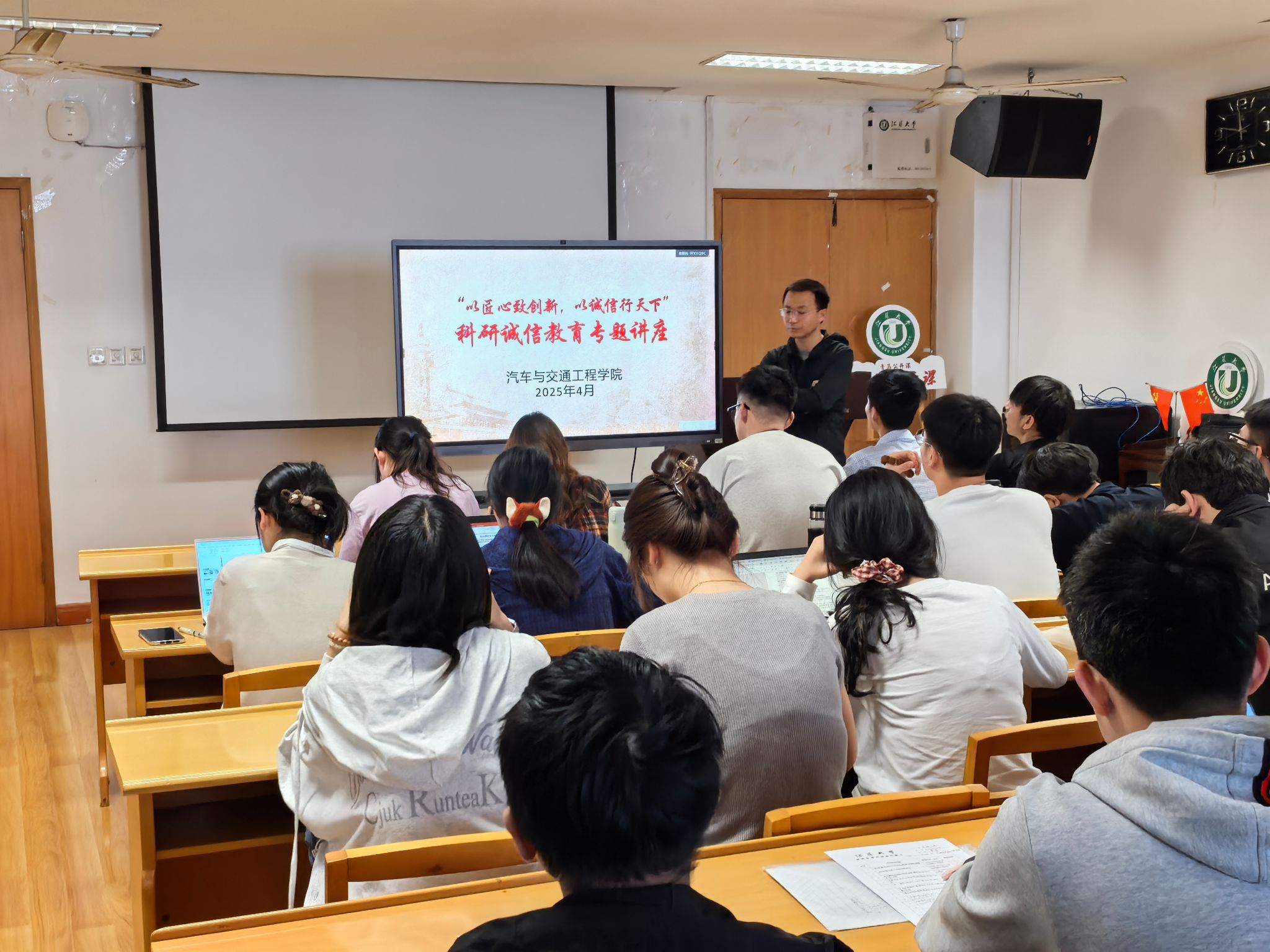 为进一步引导研究生树立求真务实的学习态度,弘扬科学精神,筑牢学术道德与国家安全底线,4月23日,汽车学院在311报告厅举办了“以匠心致创新,以诚信行天下”研究生科研诚信与国家安全教育专题讲座。讲座由交通运输系教师宋茂灿主讲,全体在校研究生参加。