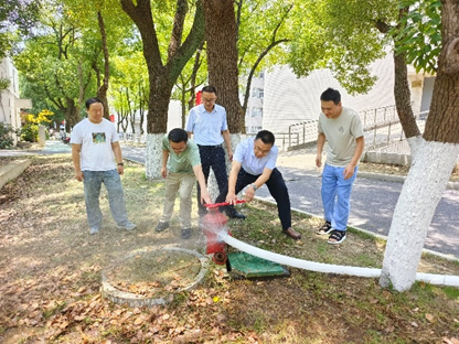 演练现场,耿院长强调暑假人员流动少,但消防安全意识不可松懈,教职工需掌握消防技能。随后,重点介绍室外消火栓及配套扳手使用,讲解“一甩两接柠到底”口诀:甩开消防水带,连接消火栓与水枪并拧紧。防应急小组成员们认真聆听并实操练习。