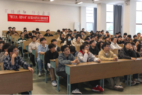 为进一步拓宽毕业生就业渠道,促进产教融合,4月8日,汽车学院与小米汽车联合打造的2027届小米汽车工程师训练营宣讲及启动会在主A楼301教室举行。此次训练营以产教融合为核心,精准对接汽车产业高质量发展的人才需求,专为车辆相关方向的2027届毕业研究生量身打造,既是校企双方深化合作和协同育人的重要举措,也为高校学子搭建了从校园到企业的专业实践与职业发展桥梁,助力学子提前锁定秋招offer,夯实专业能力。