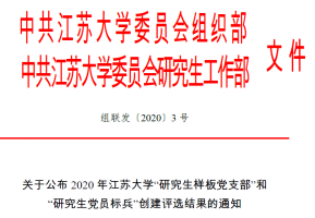 在学校组织开展的2020年江苏大学“研究生样板党支部”和“研究生党员标兵”(简称“研究生党建双创”)评选中,经组织推荐、资格审核、评审公示,我院李幸军同学脱颖而出,被评为“研究生党员标兵”。