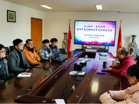 为了解家庭处于疫情中高风险地区学生的学习、生活、家庭和寒假返乡等情况,进一步关心学生身体健康,1月12日下午在汽车楼310会议室召开了汽车学院疫情中高风险地区学生防控座谈会,会议由学院党委副书记、副院长杨建同志主持,研究生专职辅导员汪峥嵘和本科、研究生代表参加。
