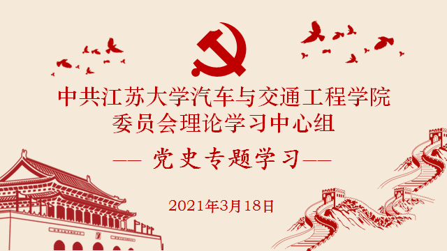 3月18日汽车学院党委理论学习中心组专题进行党史学习,学院全体党委委员参加学习,党委书记江浩斌、副院长耿国庆、党委委员丁华作重点发言。党委书记江浩斌主持学习。