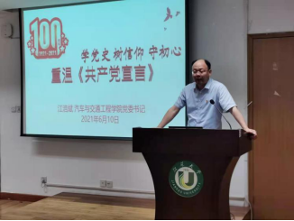 6月10日,汽车学院举办了党史学习教育“书记党课”,汽车学院党委书记江浩斌为全院100多名师生党员做了题为“学党史、树信仰、守初心——重温《共产党宣言》”的党课。本次党课既是汽车学院党史学习教育计划中“五个一”的重要部分,也是汽车与交通工程学院、汽车工程研究院联合分党校的党课第二讲。党务办主任罗晓庆主持党课。