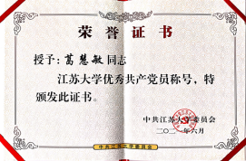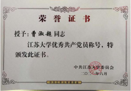 汽车学院动力系教工党支部荣获江苏大学“先进基层党支部”,汽车学院车辆系教工党支部荣获江苏大学“党建工作样板支部”,葛慧敏、曹淑超荣获江苏大学“优秀共产党员”荣誉称号。