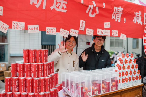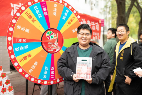 随后,在志愿者的引领下,同学们步入抽奖转盘区进行抽奖。转盘设有一等奖、二等奖、三等奖、优秀奖及幸运奖,对应着寓意深远的各式礼品:“考研加油包”内含象征“事事如意”的柿子钥匙扣、寓意“金榜题名”的笔记本,以及专为他们定制的考研可乐;更有寓意“未来可期”的笔记本套盒、印有“元气满满,好运连连”的定制可乐,以及点缀着小红花图案的养生花茶礼盒,每一件礼品都凝聚着对考研学子深深的祝福与鼓励,助力他们驱散焦虑,轻松减压,以更加平和的心态迎接挑战。