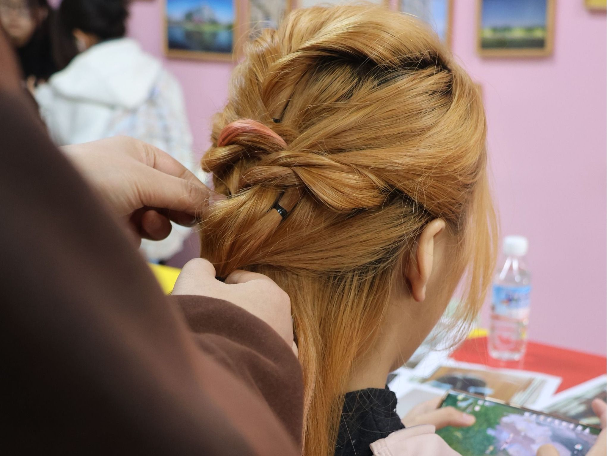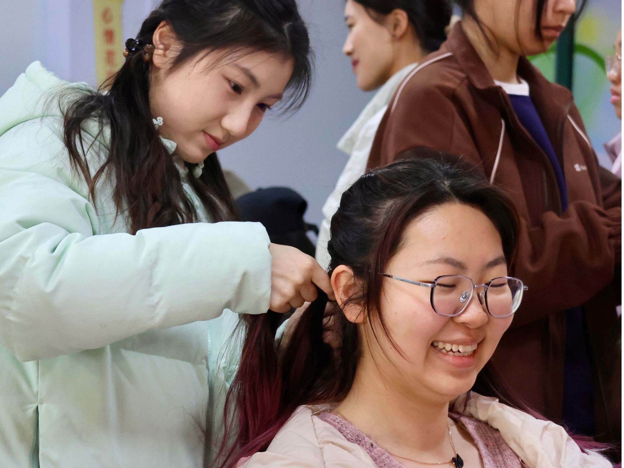编发区同样热闹非凡。专业编发师根据个人风格,打造俏皮双马尾、优雅古典盘发等时尚造型,让女同学们焕发别样光彩。大家交流发型心得,欢声笑语不断,洋溢着女性之间的美好情谊。