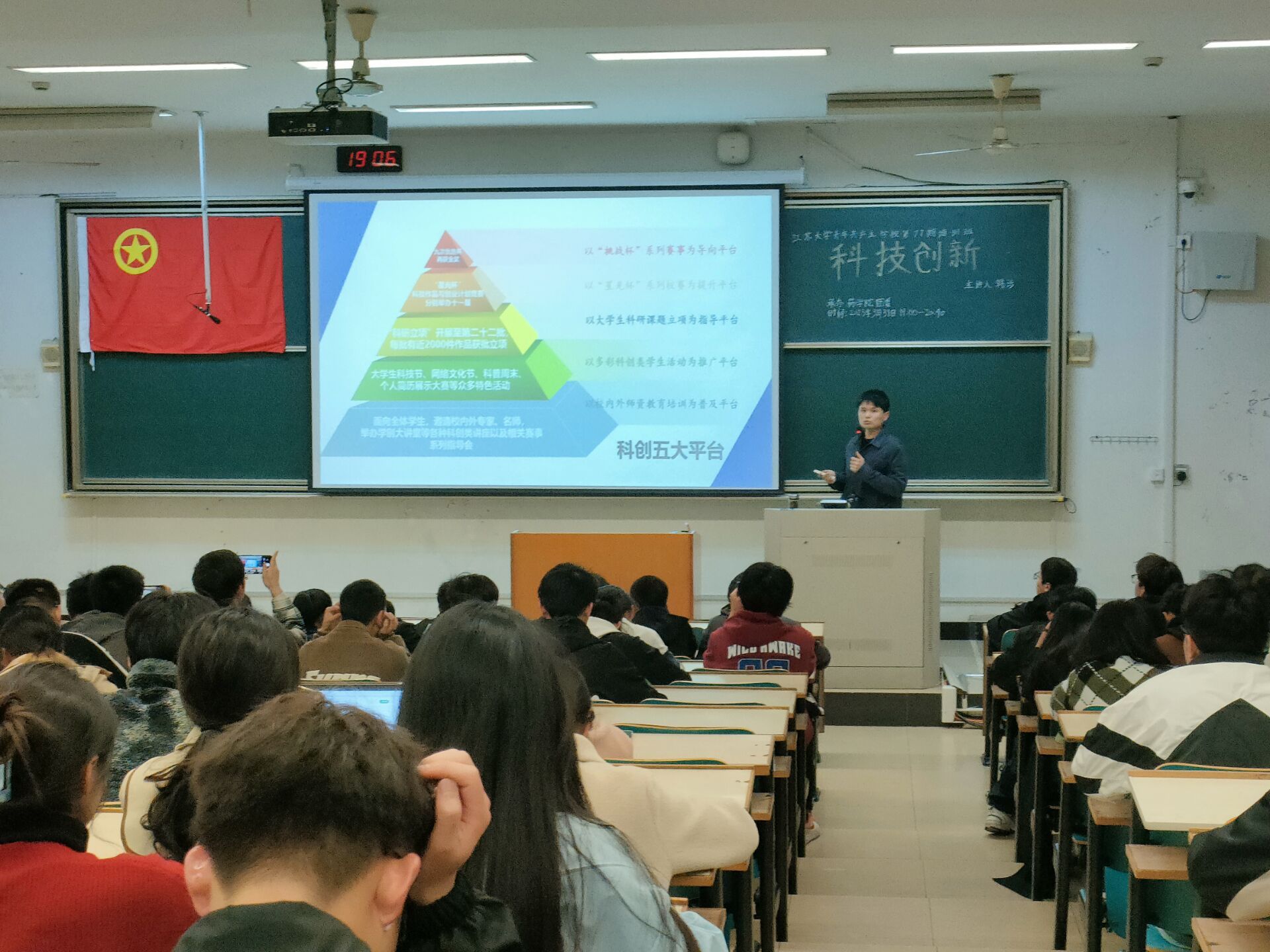 3月31日,由校团委主办,汽车与交通工程学院、食品与生物工程学院、艺术学院、药学院、财经学院、环境与安全工程学院、机械工程学院、卓越学院承办的第77期团校第6讲“科技创新”主题团课开讲,本次团课由江苏大学团委韩涉老师担任主讲嘉宾,来自8个学院的近百名团干部参加了此次团课。