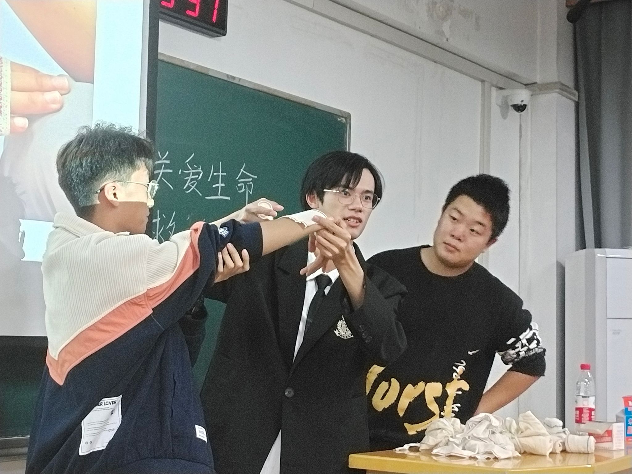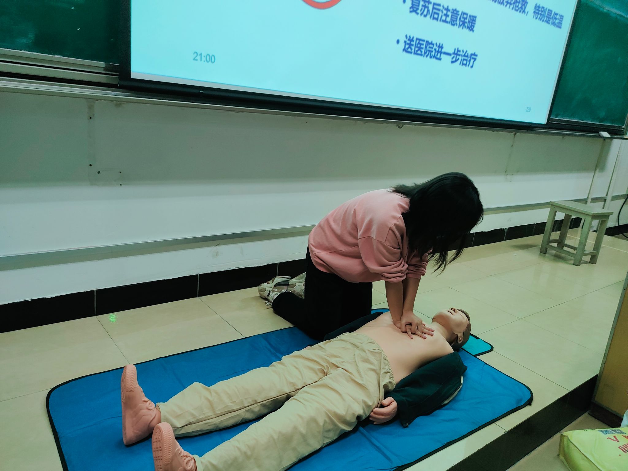 经过简短的介绍,志愿者们先向同学们普及了急救的基础知识,并以基本概念为主,相关事例为辅,向同学们展示不同创伤的应对方法。随后到了实践环节,基础包扎和CPR心肺复苏教学使同学们了解了基本的急救护理的知识,并逐渐掌握基本的急救护理的方法,有助于大家在遭遇急病或意外伤害时能够实现科学的自救互救。