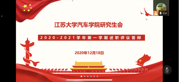 为了推动院研究生会工作制度化和规范化,充分其发挥桥梁和纽带作用,12月18日,汽车学院在腾讯会议上举办2020-2021学年研究生会学院第一学期述职评议答辩会。会议由徐志建同学主持,院党委副书记、副院长杨建,院团委副书记陈佳楠,辅导员刘波涛以及四名学生代表担任评委,全体研究生会部长及以上成员参与答辩会。