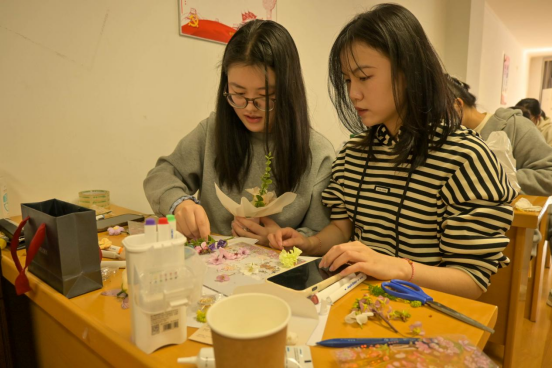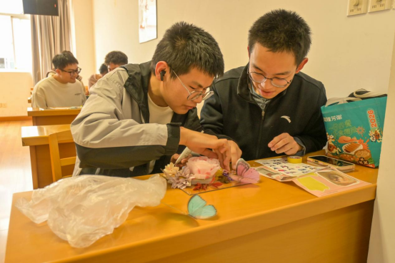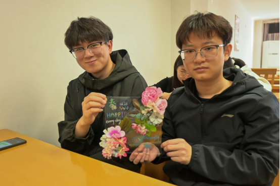 比赛现场氛围热烈有序,参赛学生化身“手作设计师”,充分发挥想象力与创造力。大赛仅提供亚克力板与专用胶水作为基础材料,创作素材由同学们自主筹备,鲜花、落叶、原创画作等琳琅满目。不少同学融入闲置配件、废旧材料,将环保理念融入创作。大家细致搭配,将亚克力板通透质感与素材美感完美融合:拼贴区定格春日烂漫,造型区打造灵动蝴蝶贴合主题,心语书写处写下暖心话语。沉浸式创作中,同学们舒缓学业压力,让环保与心理疗愈碰撞出别样火花。