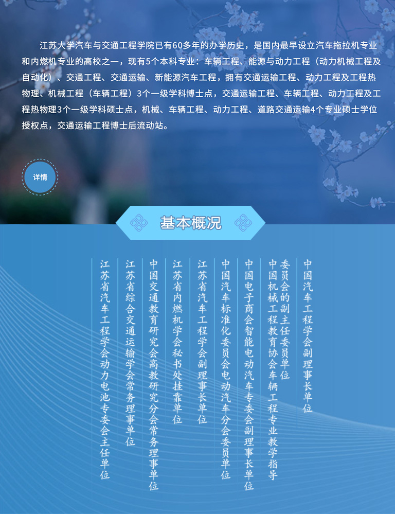 江苏大学汽车与交通工程学院已有60多年的办学历史,是国内最早设立汽车拖拉机专业和内燃机专业的高校之一,现有5个本科专业:车辆工程、能源与动力工程(动力机械工程及自动化)、交通工程、交通运输、新能源汽车工程,拥有交通运输工程、动力工程及工程热物理、机械工程(车辆工程)3个一级学科博士点,交通运输工程、车辆工程、动力工程及工程热物理3个一级学科硕士点,机械、车辆工程、动力工程、道路交通运输4个专业硕士学位授权点,交通运输工程博士后流动站。